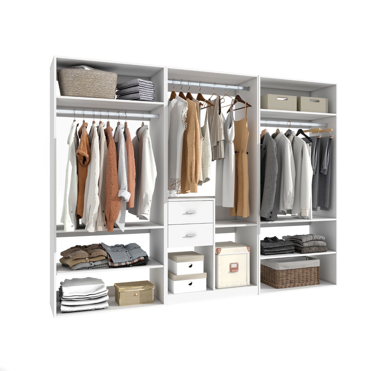 2.Flexible Storage Options: Features a combination of shelves and hanging rods to accommodate a variety of items, from folded garments to longer dresses and coats.