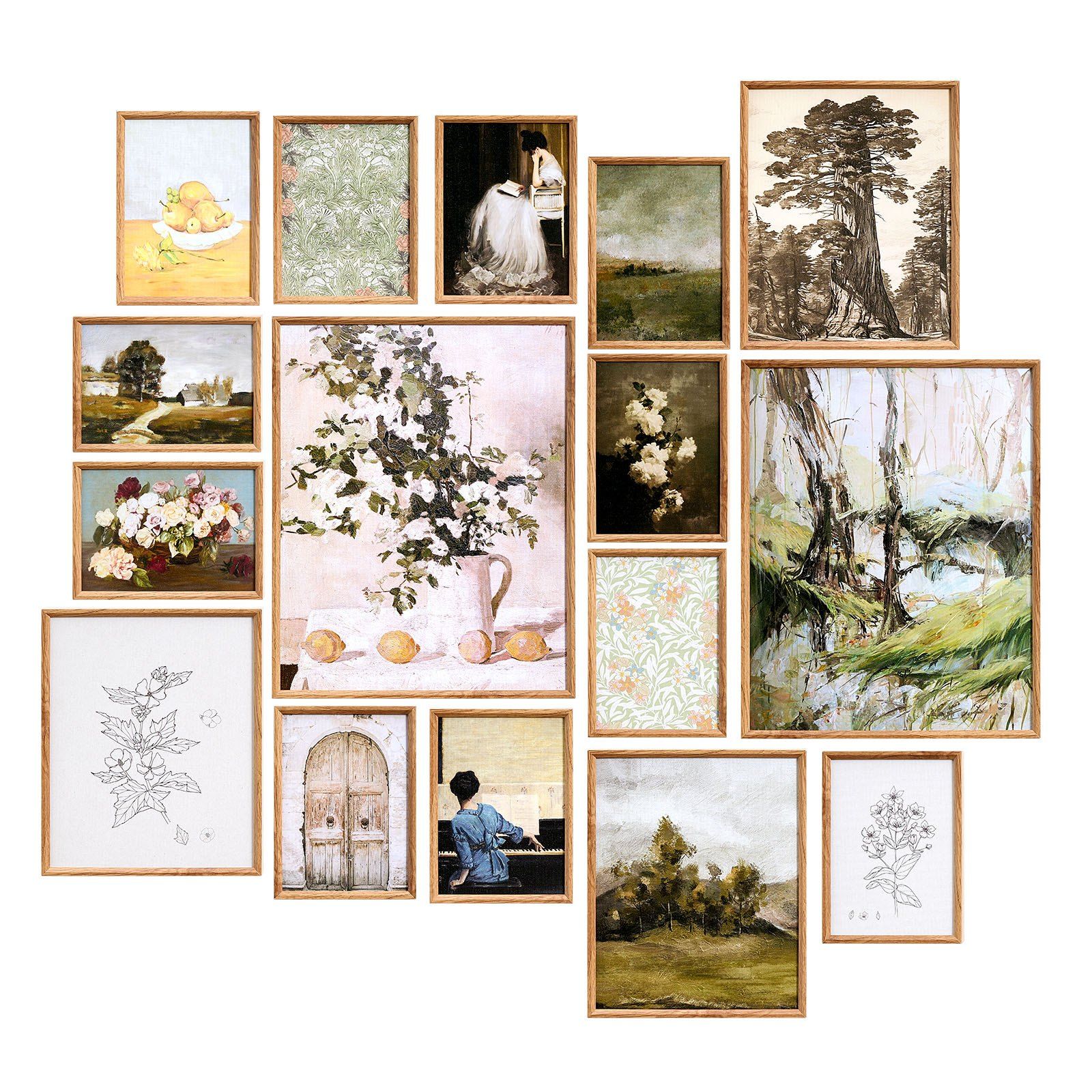 This set of 16 framed vintage prints features cozy cottage and nature scenes in oil painting style. Printed on glossy canvas with walnut frames, they offer vivid color and lasting quality. Easy to hang—ideal for home decor or gifting.